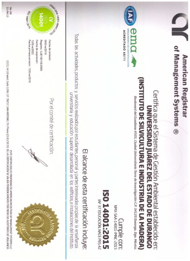 El Instituto de Silvicultura e Industria de la Madera (ISIMA) como parte de la UJED recibe y transmite los más altos principios educativos universales, dedicandose a la investigación científica y desarrollo tecnológico, generando el conocimiento que coadyuve al desarrollo del Estado y del País al fomentar la conservación del medio ambiente, el aprovechamiento integral y sustentable de los recursos naturales así como favorecer la creación y difusión de una conciencia social por la naturaleza. En compromiso con ello, se decidió implementar un Sistema de Gestión Ambiental (SGA) según los estándares de la norma ISO 14001:2015 y su equivalencia nacional NMX-SSA-14001-IMNC-2015.